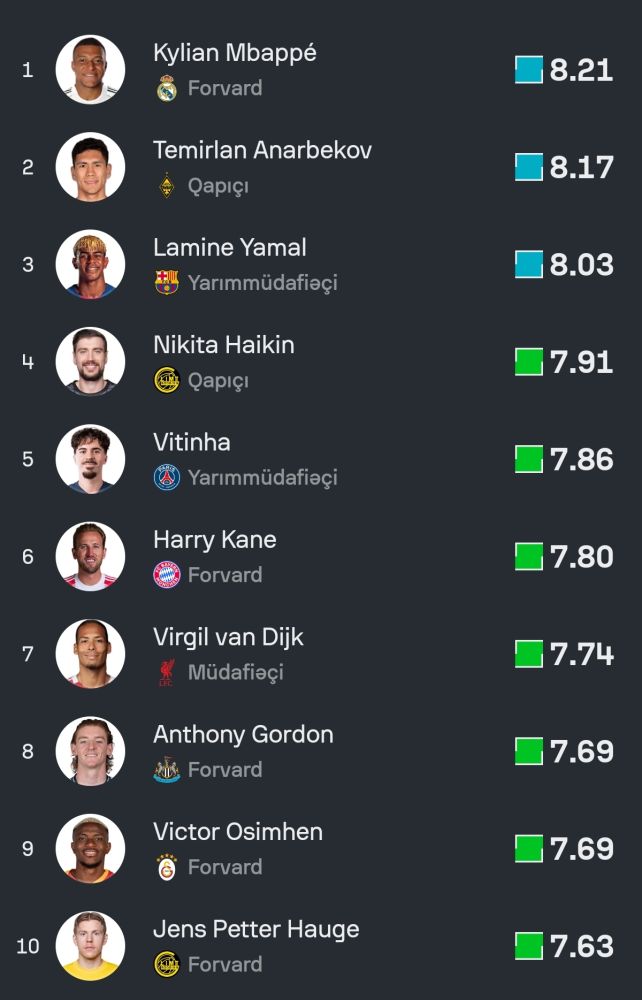 Siyahıya 8.21 orta göstərici ilə Kylian Mbappe başçılıq edir. İkinci pillədə 8.17 balla Temirlan Anarbekov (Temirlan Anarbekov) qərarlaşıb. İlk üçlüyü isə 8.03 ortalama ilə Lamine Yamal (Lamin Yamal) tamamlayır.