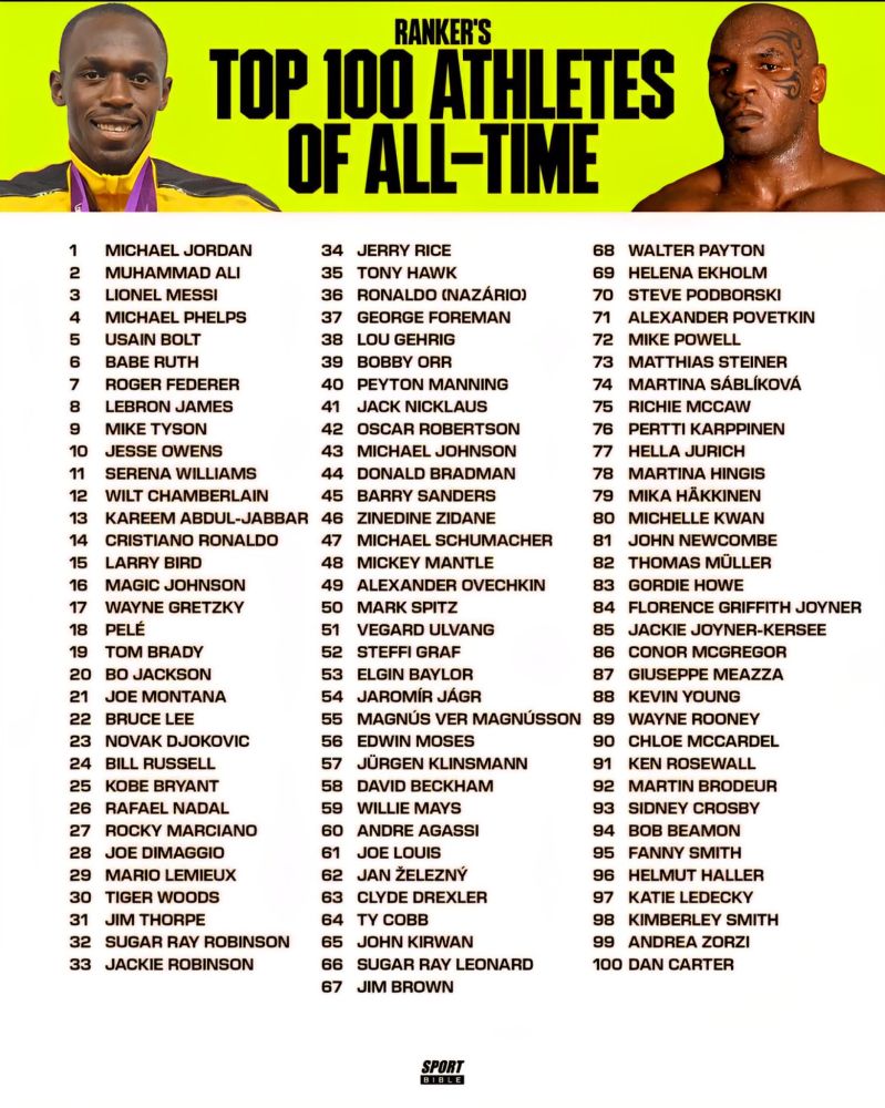 Siyahıya basketbol əfsanəsi Maykl Cordan başçılıq edir. Onu boksun simvolu Məhəmməd Əli və futbol tarixinin ən böyük adlarından biri sayılan Lionel Messi izləyir. İlk beşlikdə həmçinin üzgüçülük rekordçusu Maykl Felps və sprint üzrə dünya rekordu sahibi Useyn Bolt yer alıb.