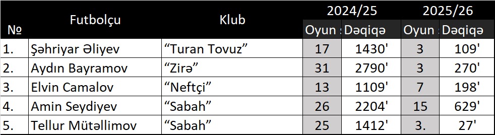 “Turan Tovuz”un birinci kapitanı olan Şəhriyar Əliyev ötən mövsümün sonlarında ciddi zədə aldı. Amma sağalandan sonra da oynamayacağını düşünmək çətin idi. Üç legioner – Miller, Urtado, Hakman triosu Şəhriyarı heyətdən sıxışdırıb çıxardı. Şəhriyar bu mövsüm cəmi üç oyuna çıxıb, birində start heyətində meydanda olub. Həmin oyunda da komandası iki qol buraxıb. Ötən mövsüm yaxşı formada olan Əliyev forma mübarizəsini aşkar şəkildə üç əcnəbi futbolçuya uduzur. Amin Seydiyev “Sabah”ın əsas kapitanıdır. Ötən mövsüm onun limitə görə məcbur oynadığı bilinirdi. Amin bu mövsüm ancaq Valdas Dambrauskas Akim Zedadkaya istirahət vermək istəyəndə onu meydana buraxır. 27 yaşlı sağ cinah müdafiəçisi bu mövsüm orta hesabla cəmi elə yaşı qədər – 27 dəqiqə meydanda olub.