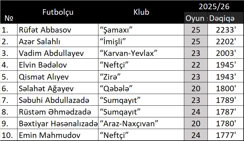 Sonda isə cari mövsüm Azərbaycan çempionatında meydanda ən çox olan yerli futbolçuları sizə təqdim edirik: