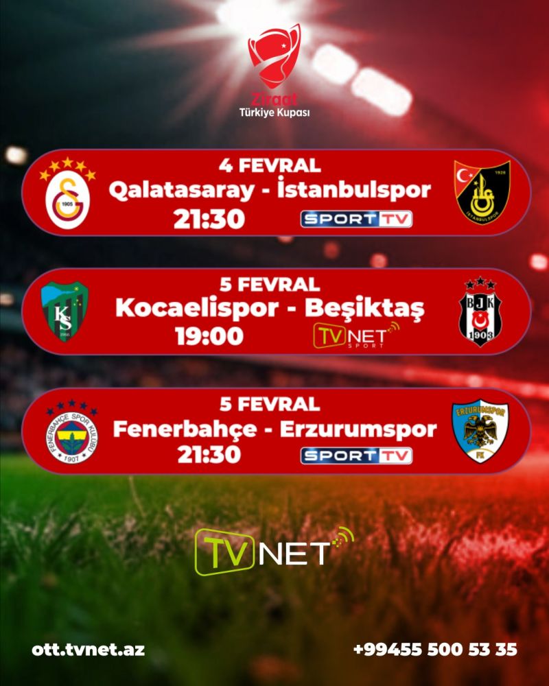 Offsideplus.az xəbər verir ki, Türkiyə futbolunun nəhəngləri növbəti mərhələ uğrunda meydanda üz-üzə gəlir. "Qalatasaray", "Fənərbağça" və "Beşiktaş"ın kubok yolu yalnız TVNET platformasında canlı yayımla evinizə gəlir.