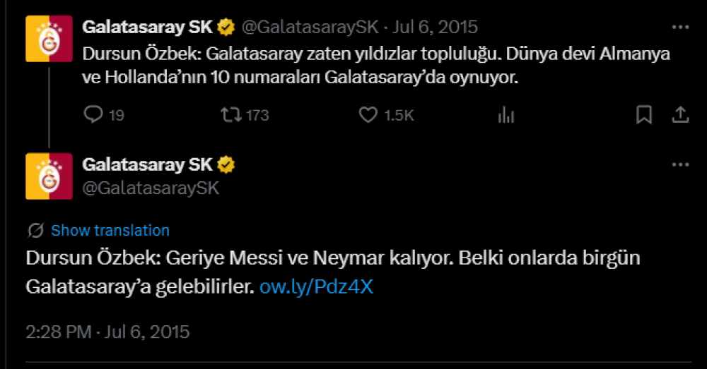 Bu günlərdə isə klub prezidenti Dursun Özbekin 10 il əvvəlki sözü xatırlandı. O, həmin vaxt: "geridə Neymar və Messi qaldı" - deyə bildirmişdi.